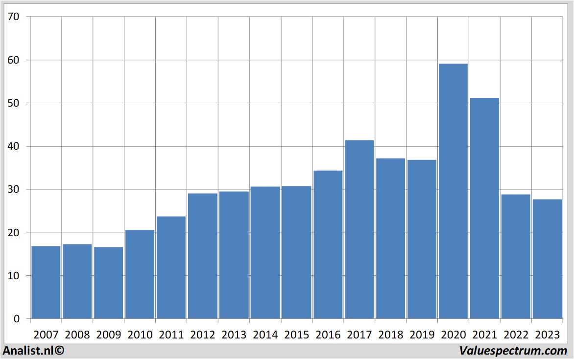 De analisten gaan voor 2023 uit van een nettowinst van 12.59 miljard dollar. Volgens de laatste rondgang langs de analisten stevent het bedrijf af op een winst per aandeel van 2.2 dollar. De koerswinstverhouding komt zodoende op 12.57 te liggen.