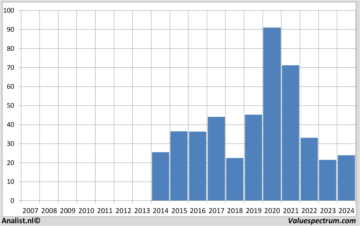 De analisten gaan voor 2024 uit van een nettowinst van 204 miljoen euro. Volgens de laatste rondgang langs de analisten stevent het bedrijf af op een winst per aandeel van 77 cent. Op basis hiervan komt de koerswinstverhouding op 30.92 te liggen.