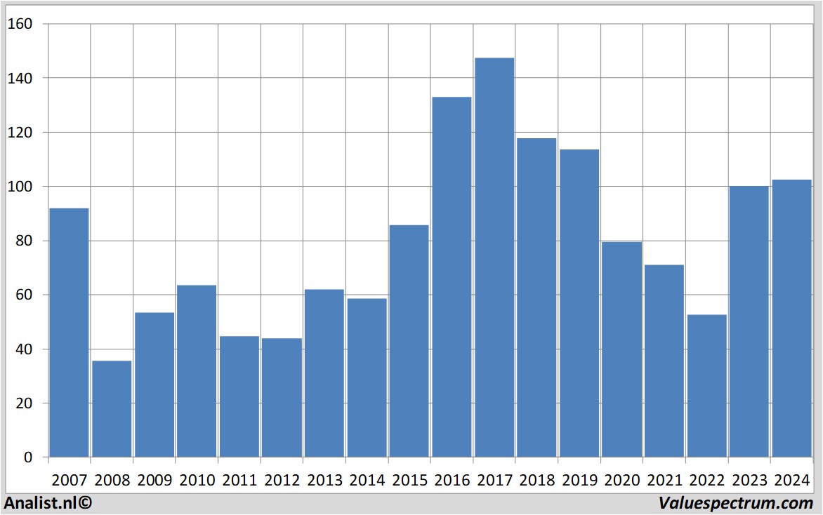 De analisten rekenen voor 2024 op een nettowinst van 569 miljoen euro. Volgens de laatste rondgang langs de analisten stevent het bedrijf af op een winst per aandeel van 7.52 euro. Op basis hiervan komt de koerswinstverhouding op 13.64 te liggen.