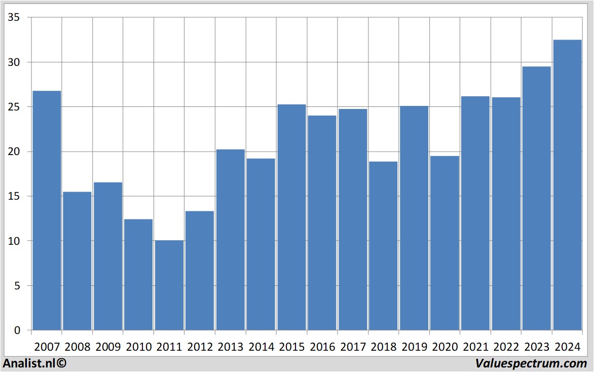 De meeste analisten gaan voor 2024 uit van een nettowinst van 7.76 miljard euro. Volgens de laatste rondgang langs de analisten stevent het bedrijf af op een winst per aandeel van 3.51 euro. De koerswinstverhouding bedraagt hierdoor 9.26.