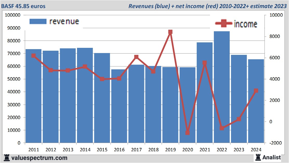 Morgen komt het Duitse BASF met haar resultaten over het voorbije kwartaal. Over 2024 verdient het bedrijf uit Ludwigshafen Am Rhein volgens de gepolste analisten uit op 65.6 miljard euro. Dit is vrij beperkt minder dan de totale omzet over 2023 toen het bedrijf 68.9 miljard euro verdiende.