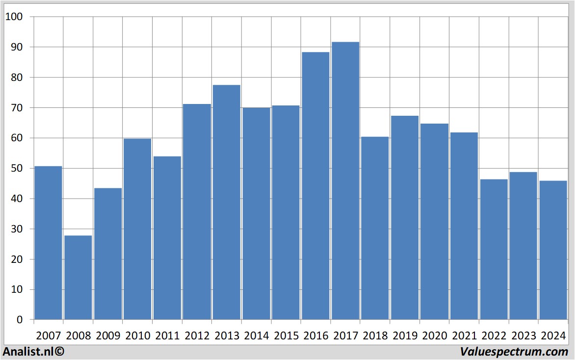 Wat betreft het resultaat rekenen De meeste analisten op een nettowinst van 2.9 miljard euro. Gezien de laatste analistenconsensus heeft het bedrijf dit jaar een winst per aandeel van 3.42 euro. Hiermee komt de koers/winst-verhouding op 13.41 te liggen.