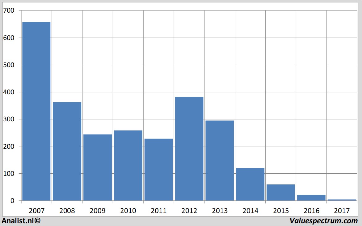 De meeste analisten rekenen voor 2017 op een nettoverlies van 379 miljoen euro. Over dit jaar komt het bedrijf volgens het gros van de analisten uit op een verlies per aandeel van 14,18 euro. Op basis hiervan komt de koerswinstverhouding op -0,34 te liggen.