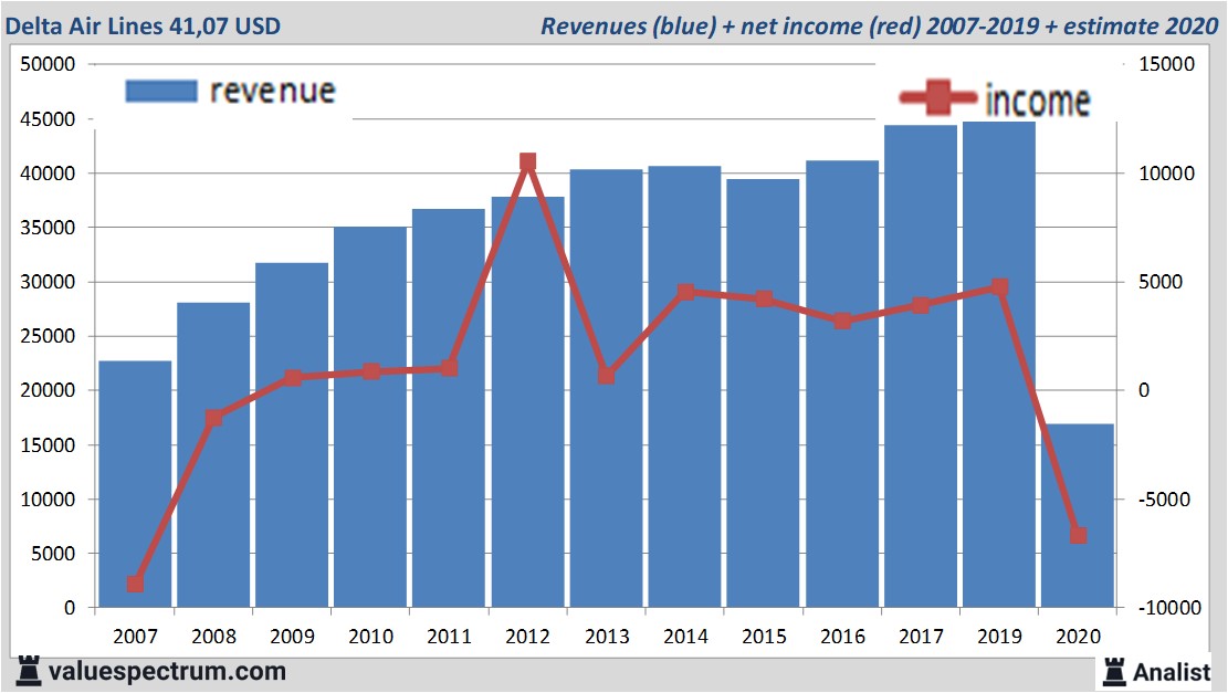 Klikt u hier voor dividend aandeel Delta Air Lines. Om 19.04 staat het aandeel 6,21 procent hoger op 41,07 dollar.