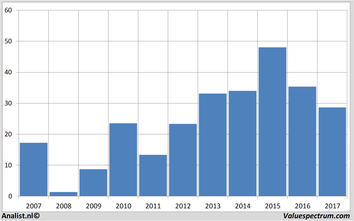 De analisten gaan voor 2017 uit van een nettowinst van 525 miljoen euro. Volgens de laatste rondgang langs de analisten stevent het bedrijf af op een winst per aandeel van 2,32 euro. De koerswinstverhouding komt zodoende uit op 12,38.