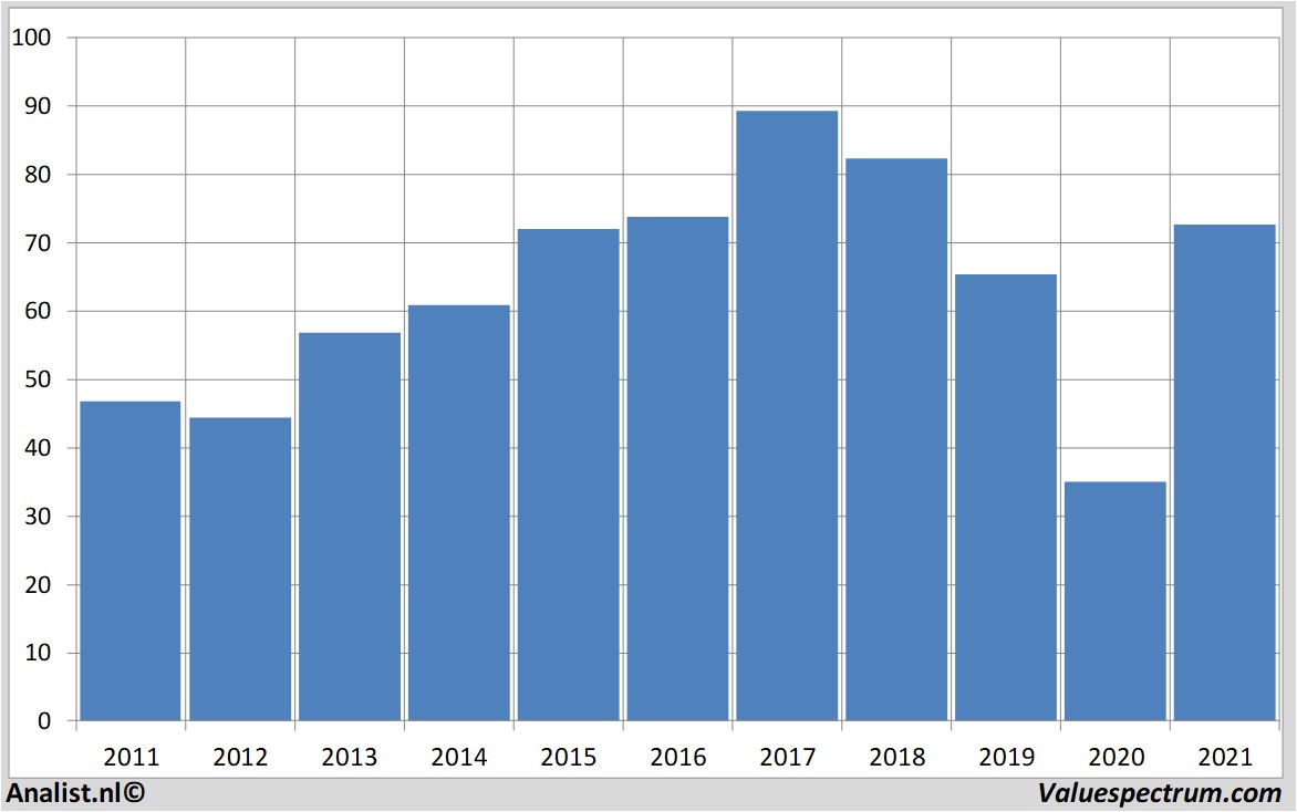 De analisten rekenen voor 2021 op een nettowinst van 1.38 miljard euro. Volgens de jongste analistenconsensus houdt het bedrijf over dit jaar een winst per aandeel van 6.87 euro over. De koers-winst-verhouding ligt hiermee op 10.57.