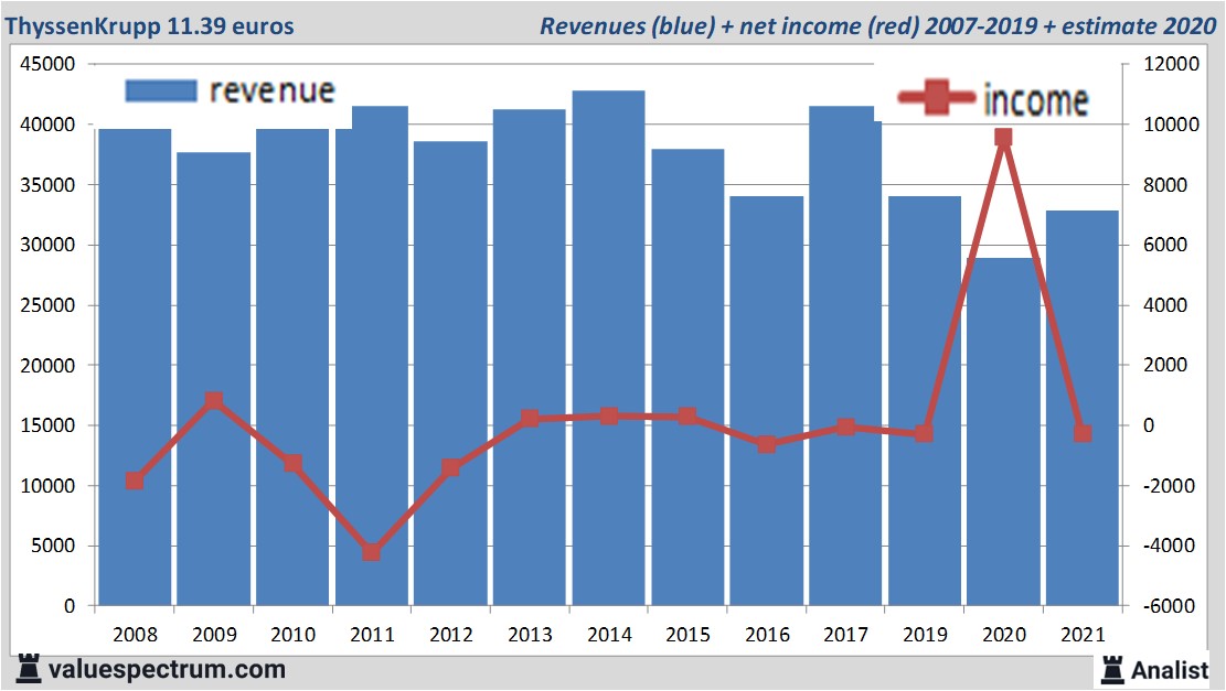 De meeste analisten rekenen voor 2021 op een nettoverlies van 302 miljoen euro. Over dit jaar ligt de consensus van ThyssenKrupp 's resultaat per aandeel op een verlies van 53 cent. De koerswinstverhouding komt zodoende uit op -21.49.