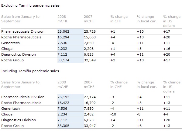 Roche is in het derde kwartaal van 2008 gestegen met 1,6% tot 11,3 miljard Zwitserse frank. De omzet was lager dan de 11,45 miljard Zwitserse frank waar analisten op hadden geanticipeerd. De lagere omzet is te wijten aan een afgenomen verkoop van het griepmiddel Tamiflu. Vanwege de angst voor een wereldwijde griepepidemie hebben verscheidene overheden en instanties de laatsste jaren op grote schaal Tamiflu ingekocht. Inmiddels zijn de voorraden van hun vol en sindsdien neemt de verkoop van Tamiflu af