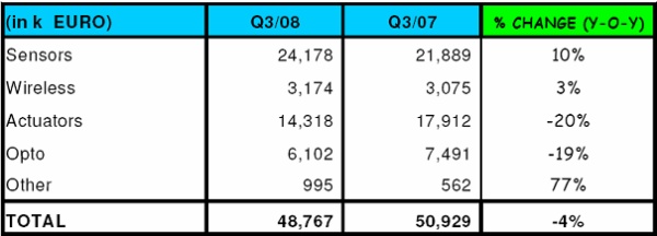 Hieronder is schematisch aangegeven hoe de verschillende afdelingen hebben gepresteerd in het derde kwartaal ten opzichte van het derde kwartaal van 2007. Sensors, de grootste afdeling heeft met 10% geholpen de marges in het derde kwartaal op peil te houden. Vooral Actuators en Opto hebben behoorlijke zwakke prestaties neergezet.