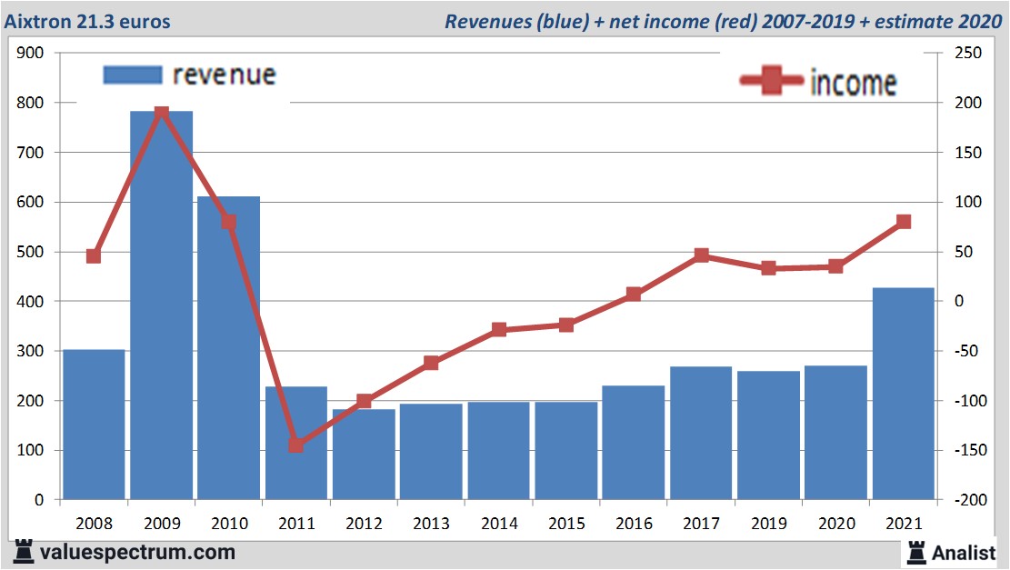 Per aandeel verwachten de analisten een dividend van 16 cent. Aixtron 's dividendrendement bedraagt dus momenteel 0.75 procent. Gemiddeld levert een aandeel in de producenten van halfgeleiders levert een beperkt dividendrendement van circa 1.12 procent op.