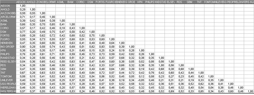 AEX -beleggers wedden hierdoor meer op 1 paard dan dat er spreidingsvoordeel is. De onderstaande correlatiematrix laat de correlatiecoëfficiënten van de individuele