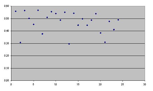 ”eenen” van de diagonaal. De plot laat zien dat de gemiddelden allemaal boven de nul noteren. Het gros ligt zelfs rond 0,50. Spreiding van