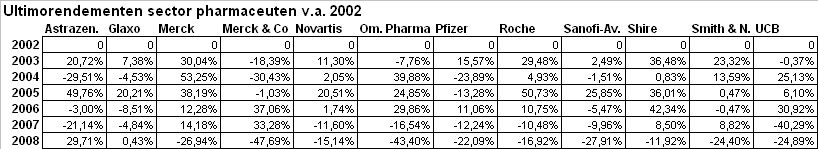 In de bovenstaande tabel staan de ultimokoersen per aandeel vermeld. De rendementen van de bedrijven (met 2001 als basisjaar) staan in de tabel hier onder vermeld. Te zien is dat de volatiliteit van de farmaceuten vrijwel net zo fors is als van de andere sectoren. Een defensief beeld valt hier dan ook niet uit af te leiden. In de regel worden deze bedrijven als defensief bestempeld maar op de beurs zijn de bèta’s desalniettemin royaal. (Hoe hoger de bèta’s hoe hoger de relatie met het marktrendement).