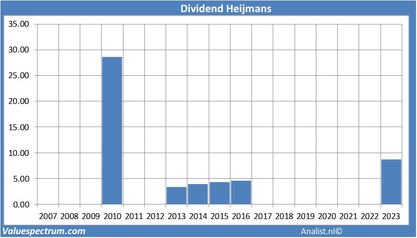 Beleggers in het aandeel Heijmans kunnen rekenen op een forse dividenduitkering. Baserend op de laatste analistentaxaties heeft het aandeel Heijmans nu één van de hoogste dividendrendementen van de Nederlandse beurs. Per aandeel rekenen de analisten op een dividend van 91 cent. Heijmans 's dividendrendement komt dus op 8.73 procent uit. Het gemiddelde dividendrendement van de bouw- en infrastructuurbedrijven ligt op een relatief royale 2.73 procent.
