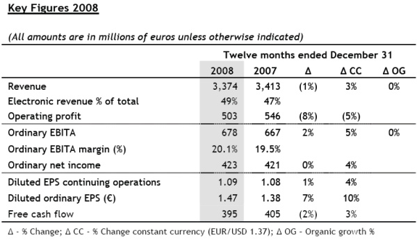 ” Wolters Kluwer delivered strong profitability & cash flow during 2008, despite challenging economic conditions. The results demonstrate the strong fundamentals of our business. We saw significant growth in our online and software solutions, strengthened our leading market positions with strategic acquisitions and launched enhanced technology platforms to provide further opportunities to embed our solutions in customer’s workflow. Our initiatives around operational efficiency, including Springboard, also provided support for our profitability.